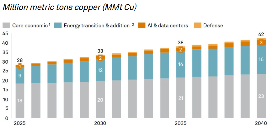 En ese sentido,S&P proyecta que la demanda por cobre aumentará de 28 millones de toneladas métricas en 2025 a 42 millones para 2040,impulsada por cuatro vectores principales: