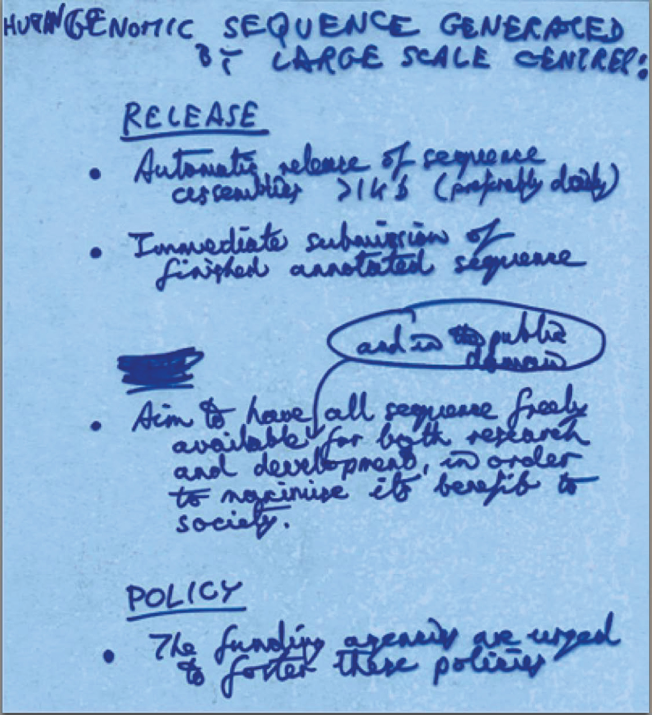 El primer borrador de los Principios de Bermudas: el borrador original de Sir John Sulston, escrito en una pizarra en febrero de 1996. (Cortesía de Richard Myers / The Bermuda Principles Foundation)
